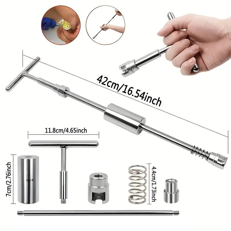 Cet appareil est constitué d'une barre masse en T avec système extensible à ressort auquel on associe un ensemble d'embouts ventouses que l'on fixe sur la partie endommagée de la carrosserie ou sur la partie cabossée de la feuille en métal.