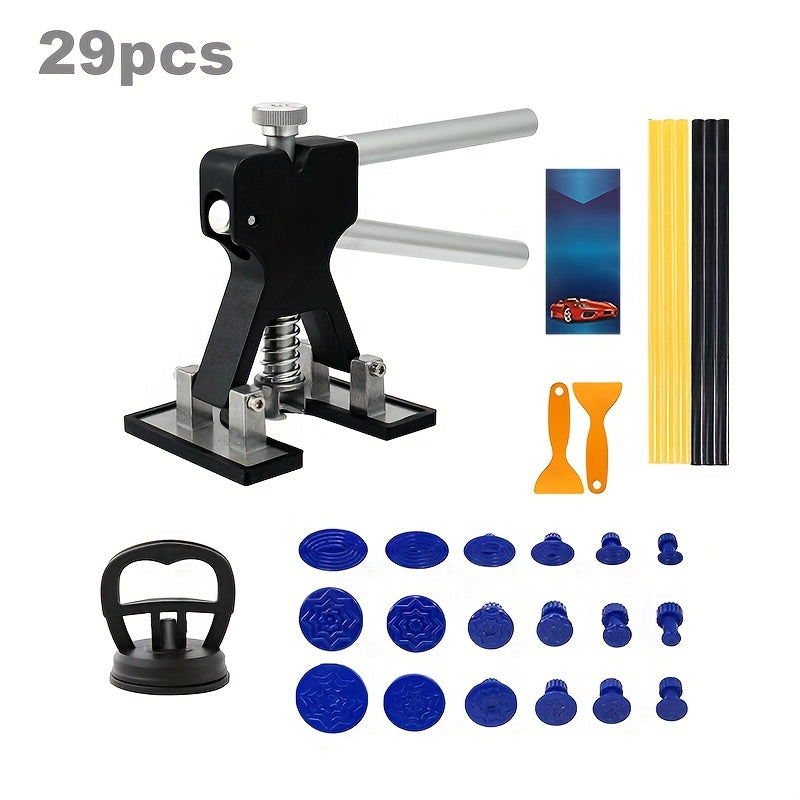 Kit complet d'outils de débosselage automatique BESPER et/ou type de presse manuelle pour réparer les carrosseries et toutes tôles de moindres épaisseur comme des appareils électroménagers (lave-linge, réfrigérateur, etc.) endommagées sans abîmer la peinture.